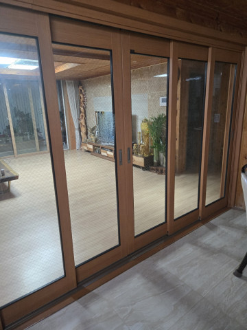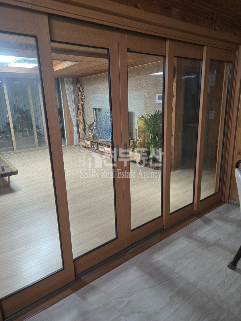 거실과 주방 사이에 망입유리 4연동 슬라이딩 도어를