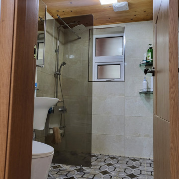 따뜻한 편백나무 소재와 고급스러운 패턴 아트월의 타일이 조화를